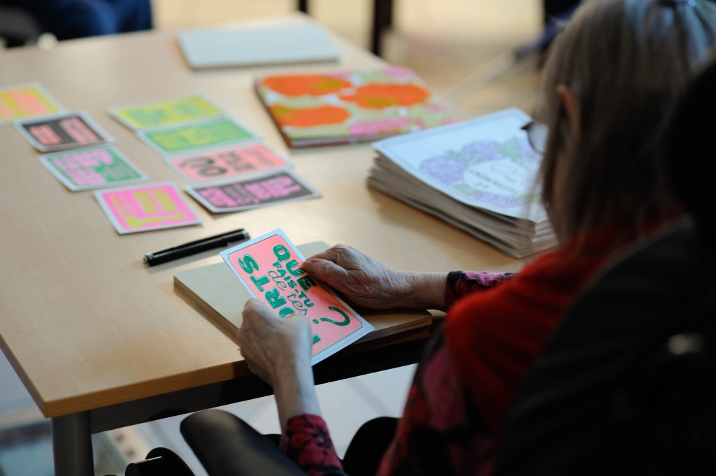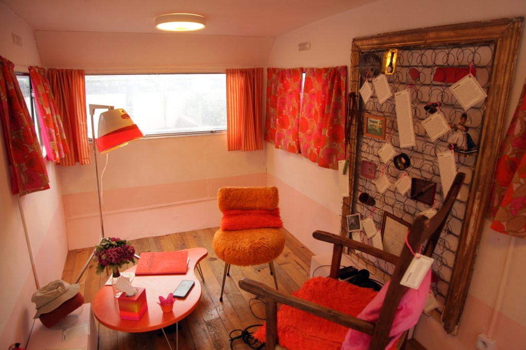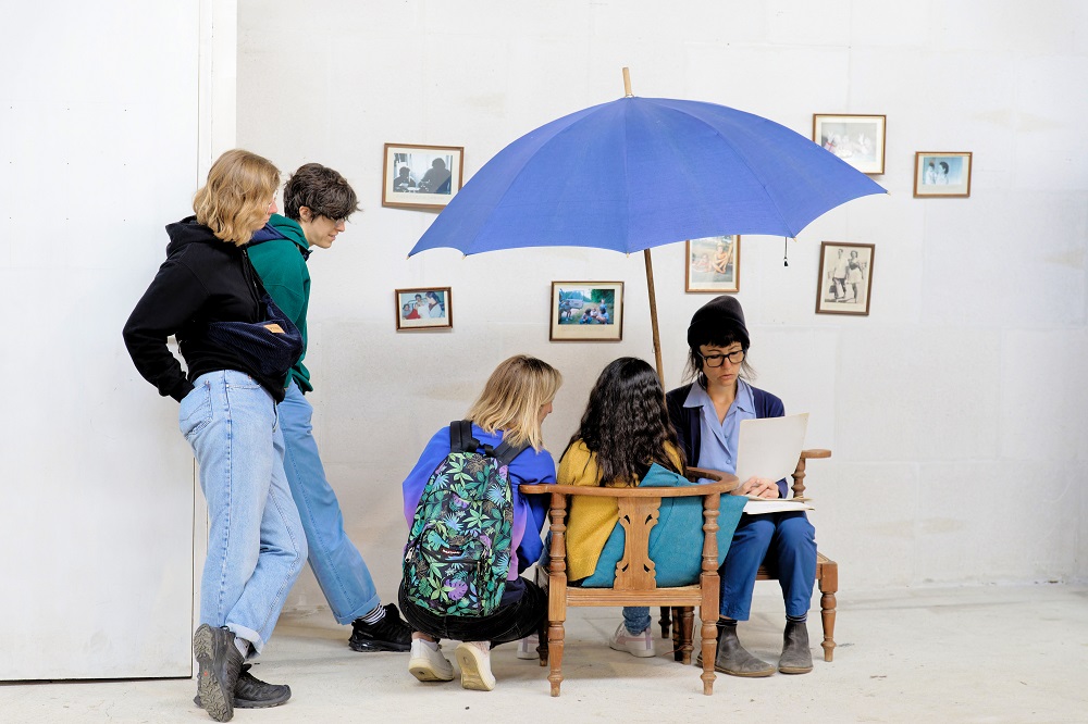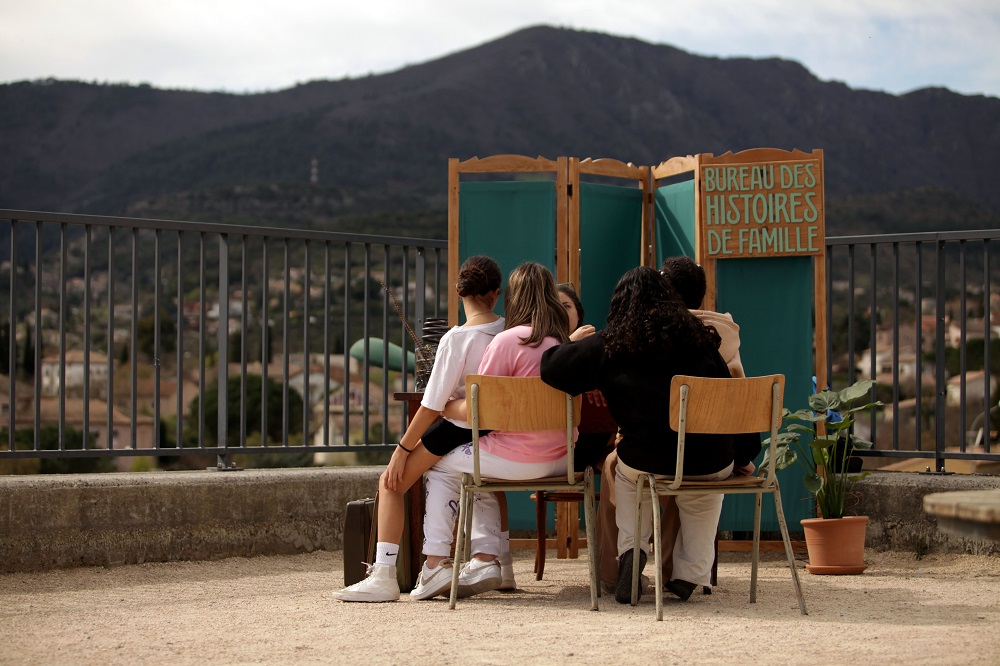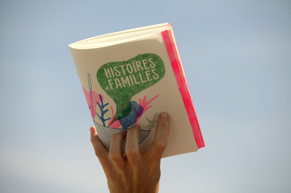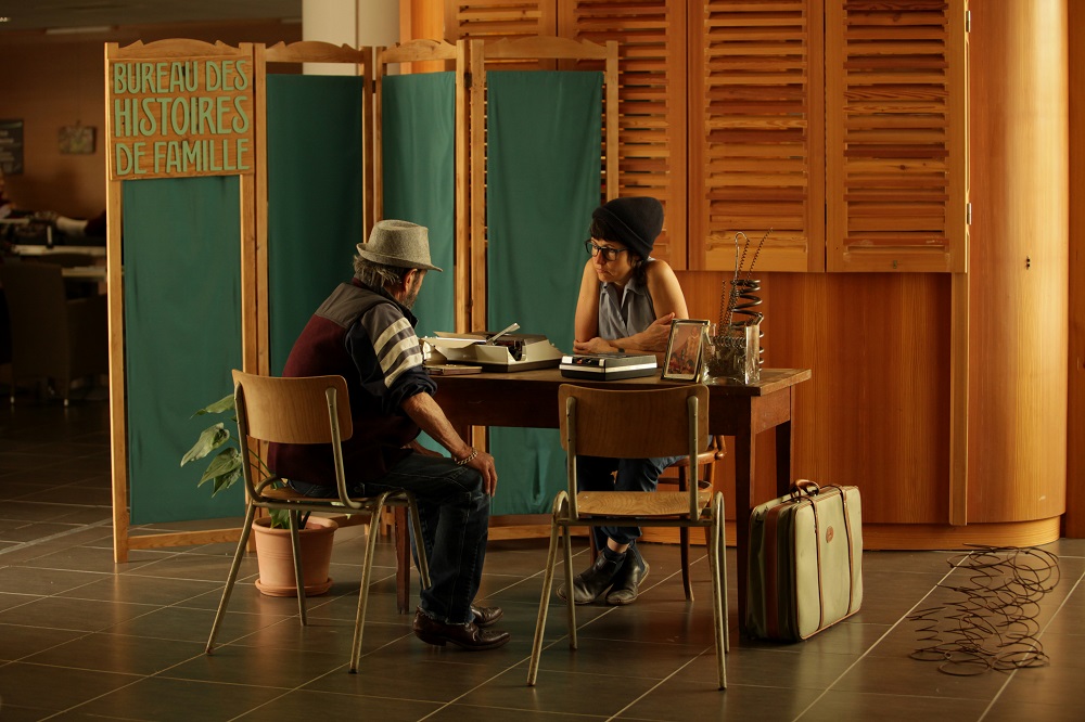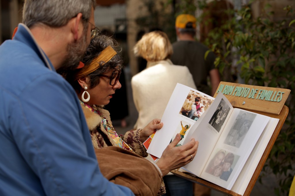 Histoires de familles, c’est une collecte de photos et la création d’un album collectif. Album qui a suivi le bureau des histoires de familles, imaginé dans une esthétique année 60, dans ses escapades sur les marchés, dans les cours de collèges, les Ehpads. Les passant.es étaient invités à s’y installer et nous glisser à l’oreille un fragment de leur histoire. Une anecdote drôle, touchante, tragique, incongrue, invraisemblable, d’apparence banale… un moment qui les a marqué.
